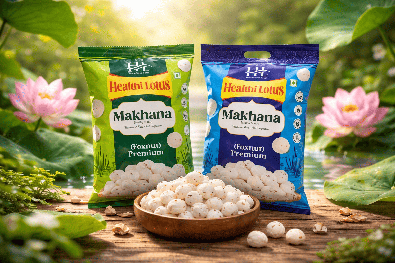 The 5+ suta makhana provides excellent texture and consistent quality, while the 6+ suta makhana delivers extra-large, superior-grade seeds with enhanced crunch and richness.