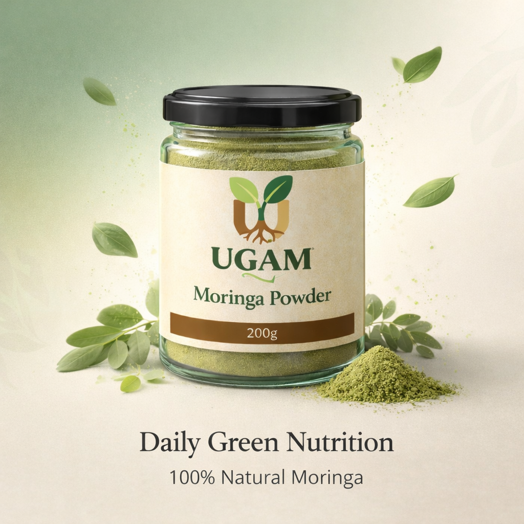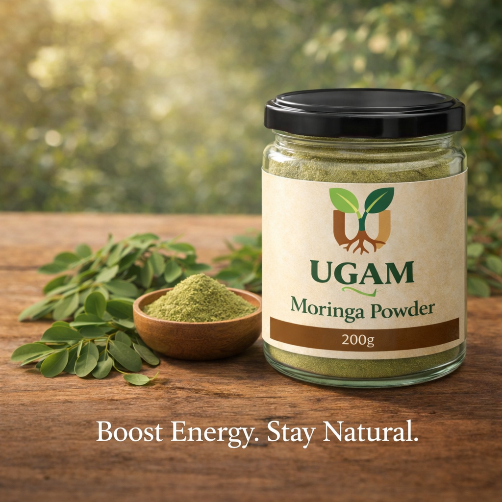 UGAM Moringa Powder is a natural superfood made from high-quality moringa leaves. Known in Ayurveda for its rich nutritional profile, it helps boost energy, support immunity, and promote overall wellness.